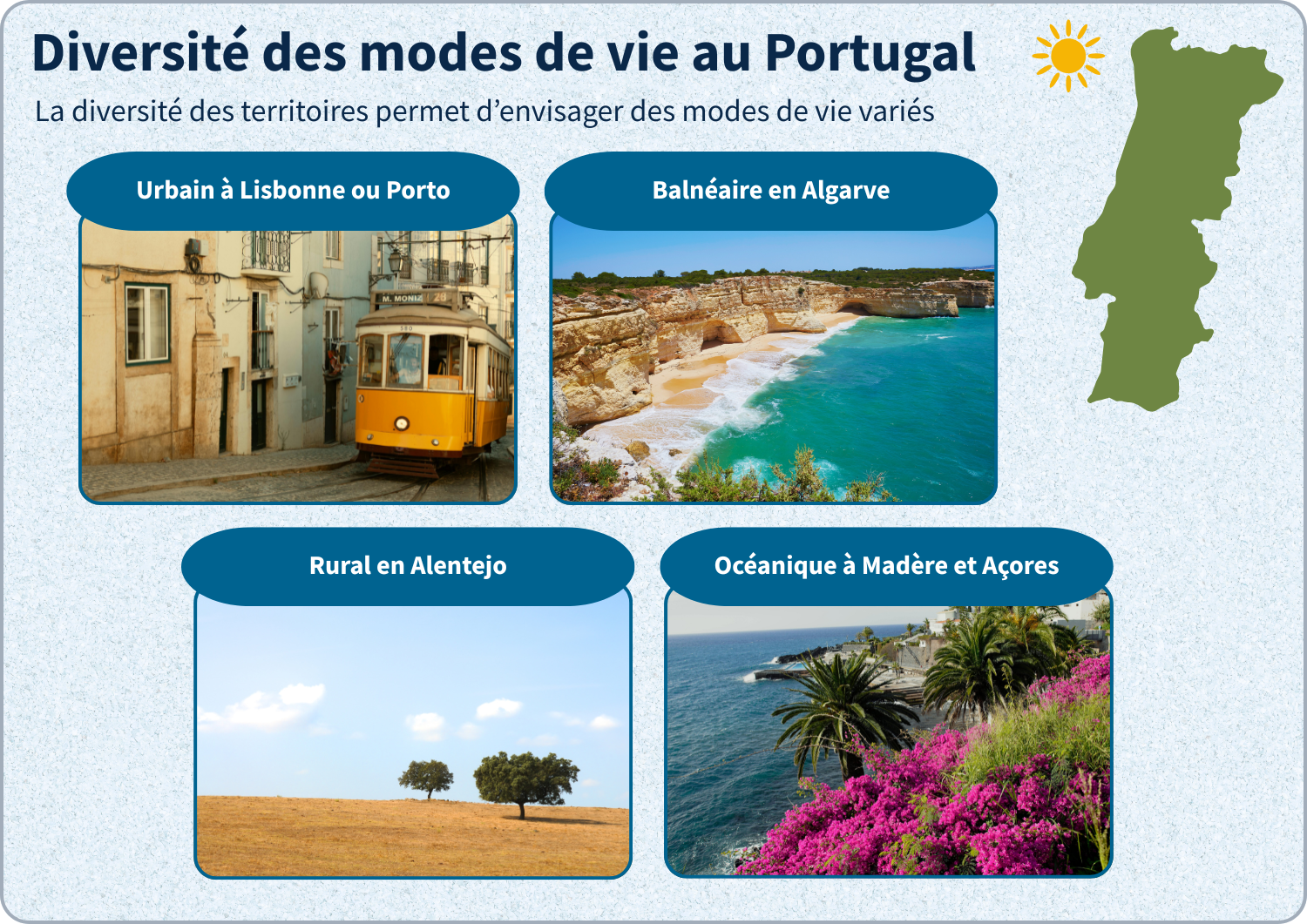 - Le climat varie fortement selon les régions : humidité dans le Nord, fortes chaleurs estivales en Alentejo, météo plus instable sur les archipels atlantiques.